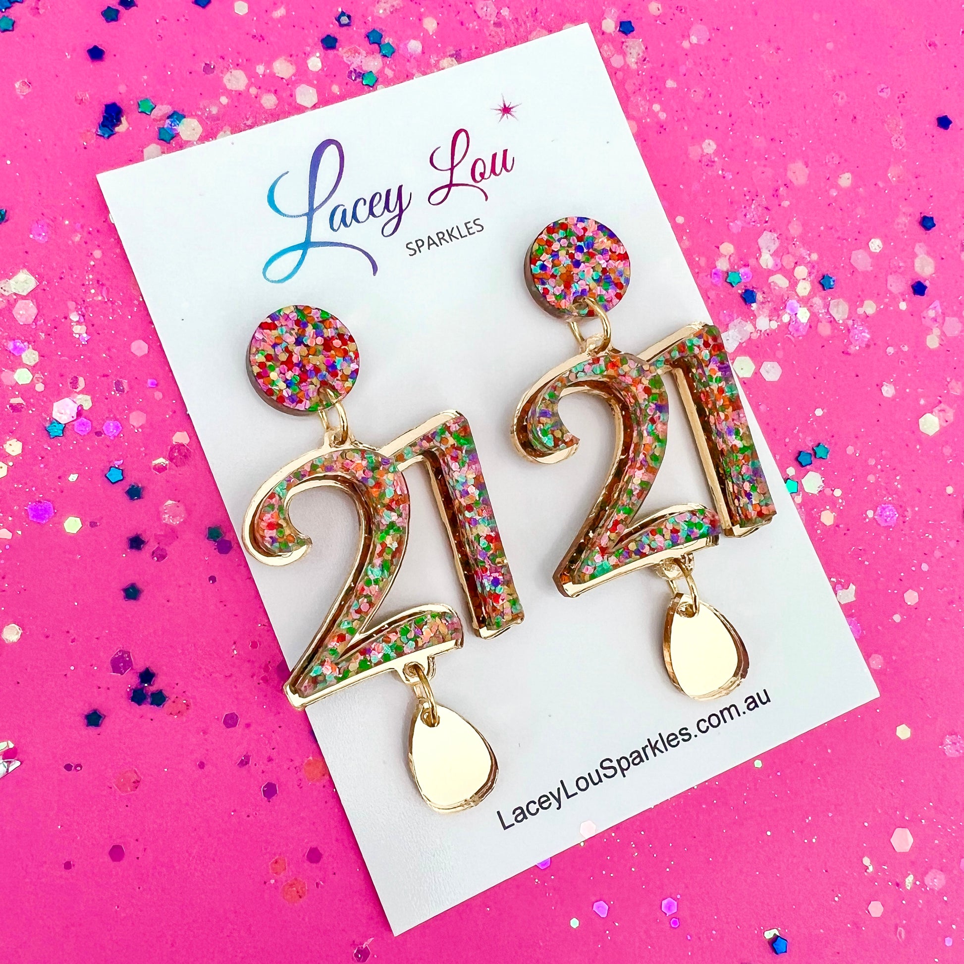 21st Birthday Statement Acrylic Earrings - Gold / Confetti