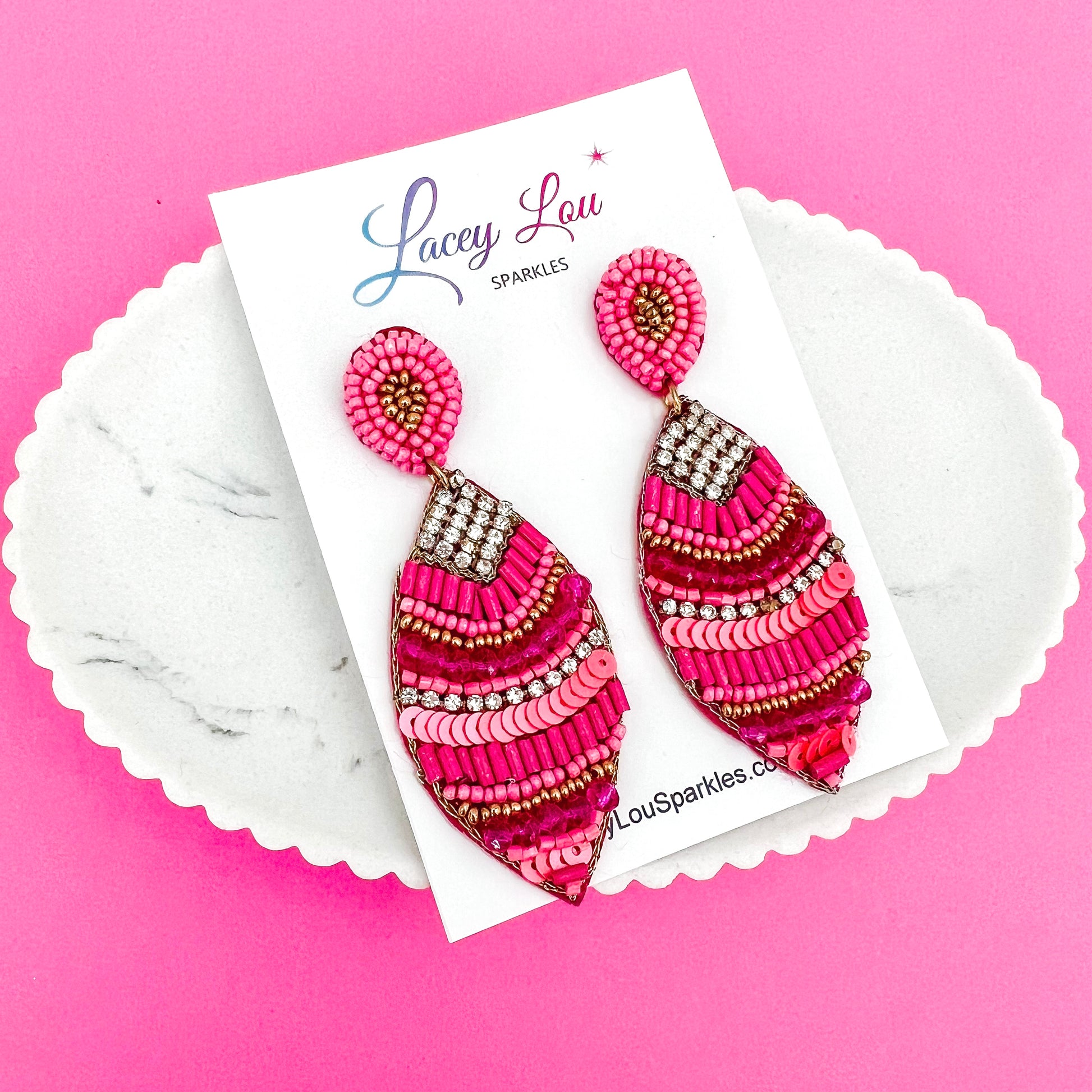Long Fuchsia Pink Beaded Leaf Statement Dangle Earrings