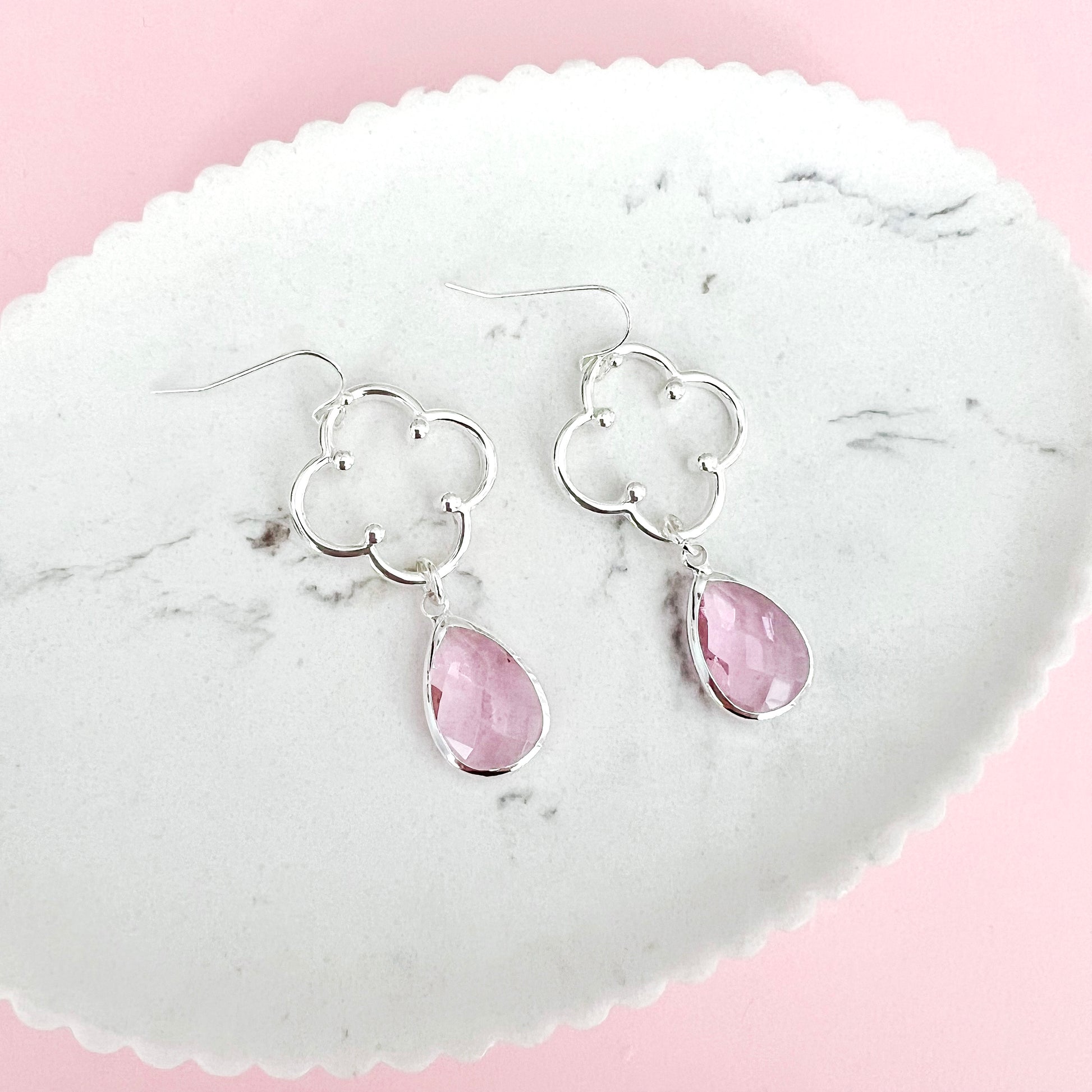 Ooh la la meet our new Camilla earrings. An elegant pink glass pendant drop earring with a silver frill attachment. These earrings are beautiful for everyday or event wear.