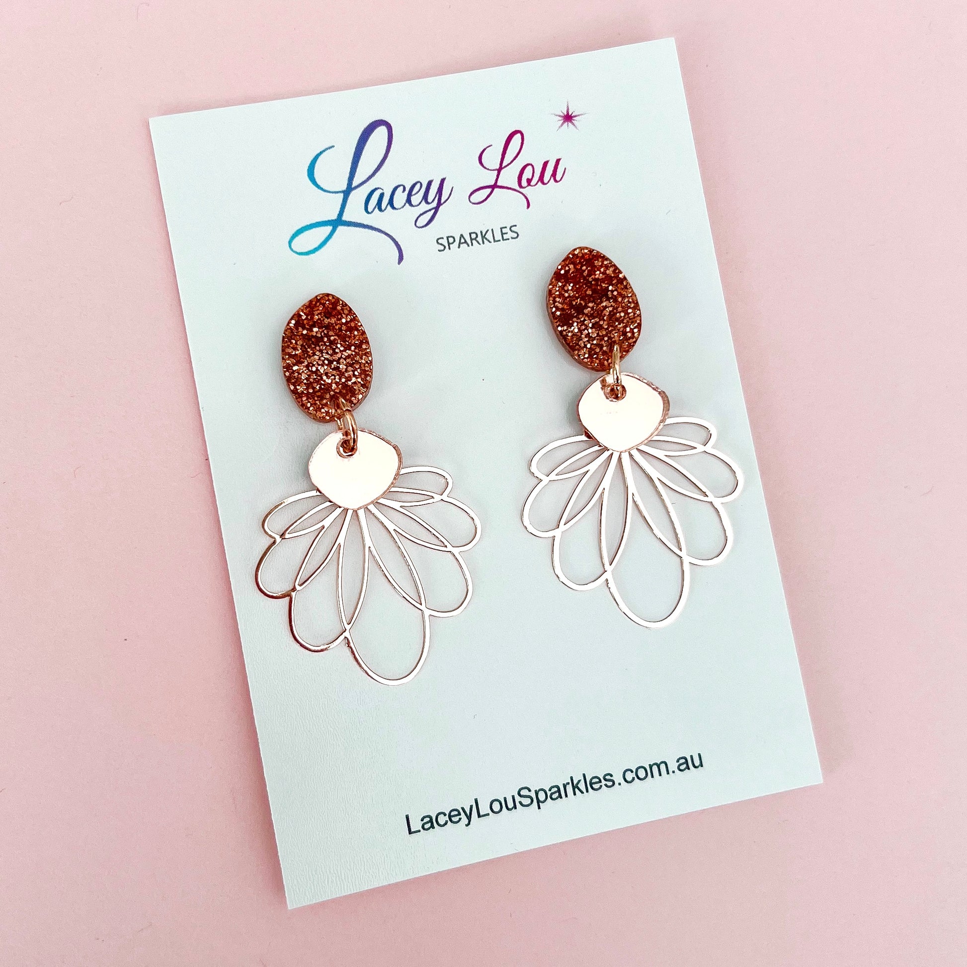 Our ever popular Caroline statement dangles are now available in four gorgeous metal colours. These earrings are created from a ultra-light rose gold metal in a floral shape. If you're looking for a stunning feather-light wear all the time statement earring, this is the one! Attached with a laser cut glitter stud topper. Stud is surgical steel - hypoallergenic.