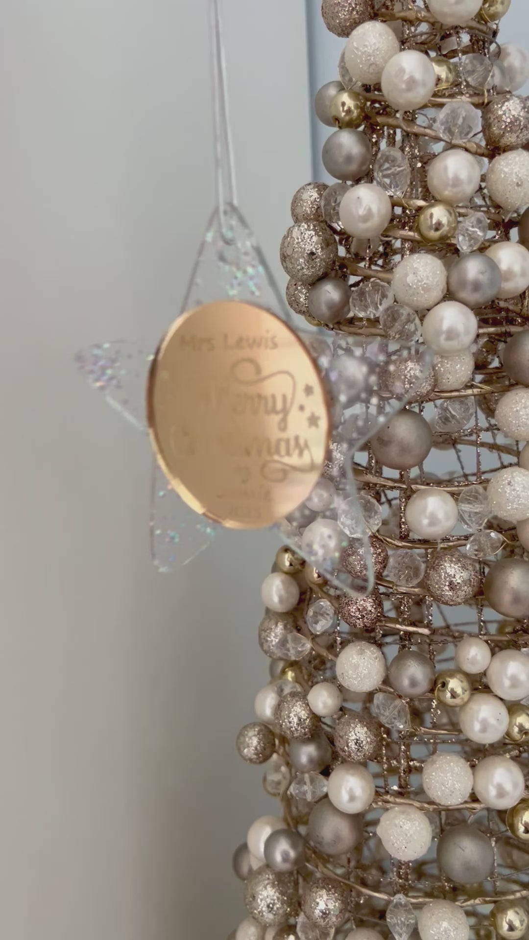 Our Christmas baubles are made from laser cut acrylic.  The bottom layer is a gorgeous clear iridescent glitter and the top layer is gold mirror.  A stunning mix of shimmer and shine - the perfect formula for Christmas.