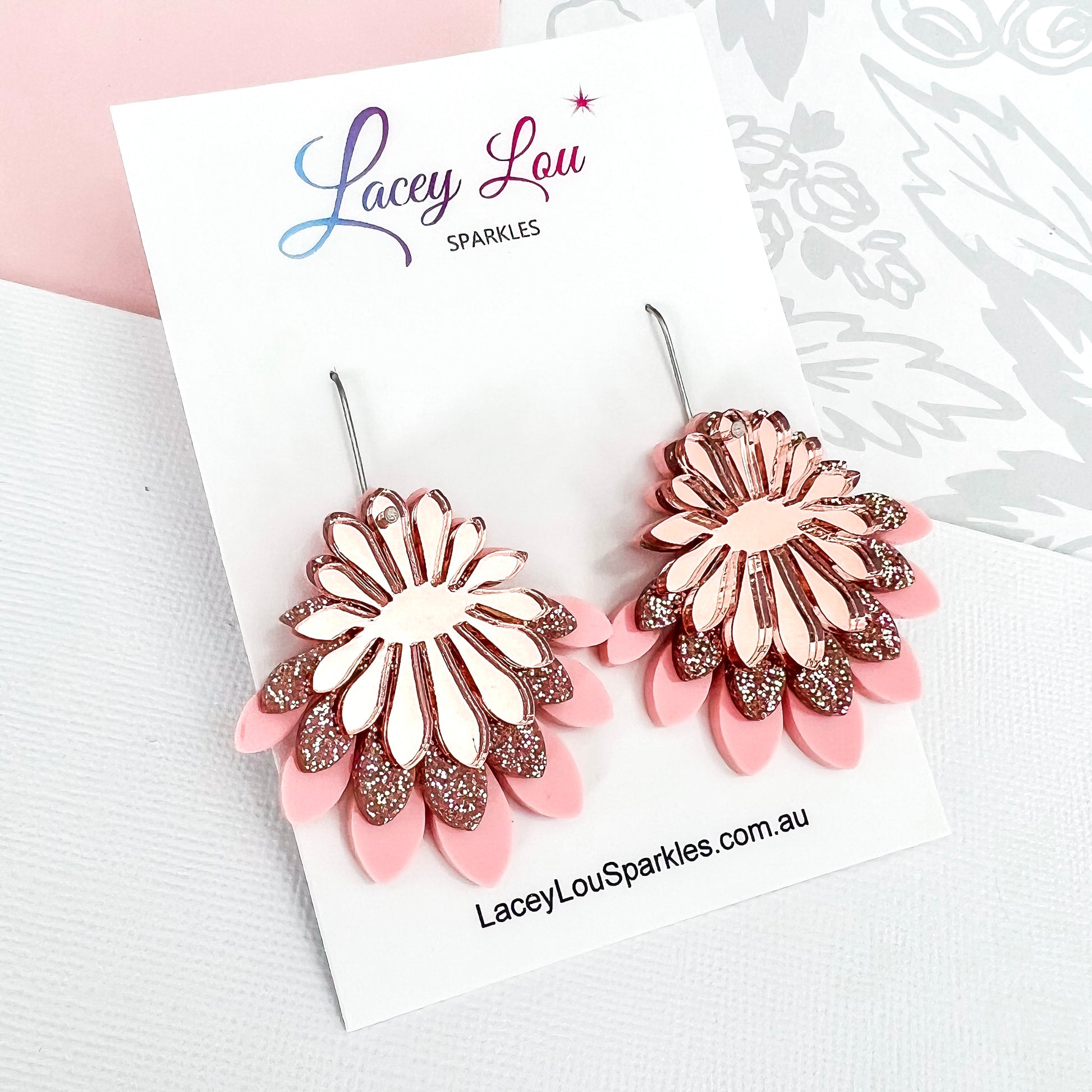Wow what a statement!! These are our gorgeous elegant floral layered dangles designed by our inhouse designers. Constructed of three layers of laser cut acrylic including rose gold mirror, rose gold glitter and opaque pale pink. All layers move independently. Acrylic is very light and comfortable to wear.