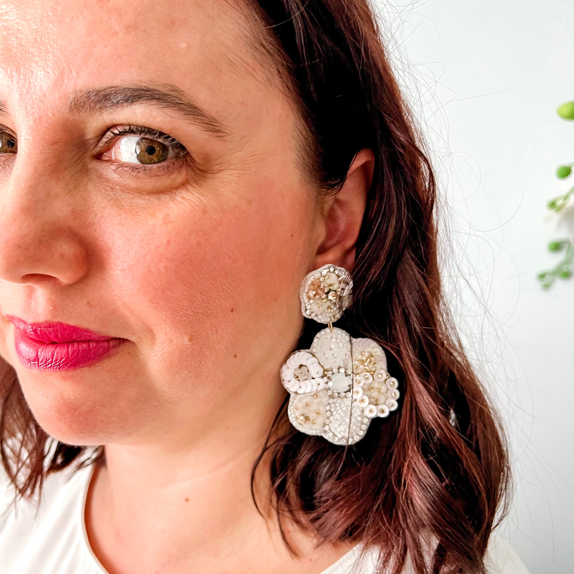 Our large mauve beaded flower earrings are such a pretty design. These large earrings are a statement piece. Crated from seed beads and sequins.