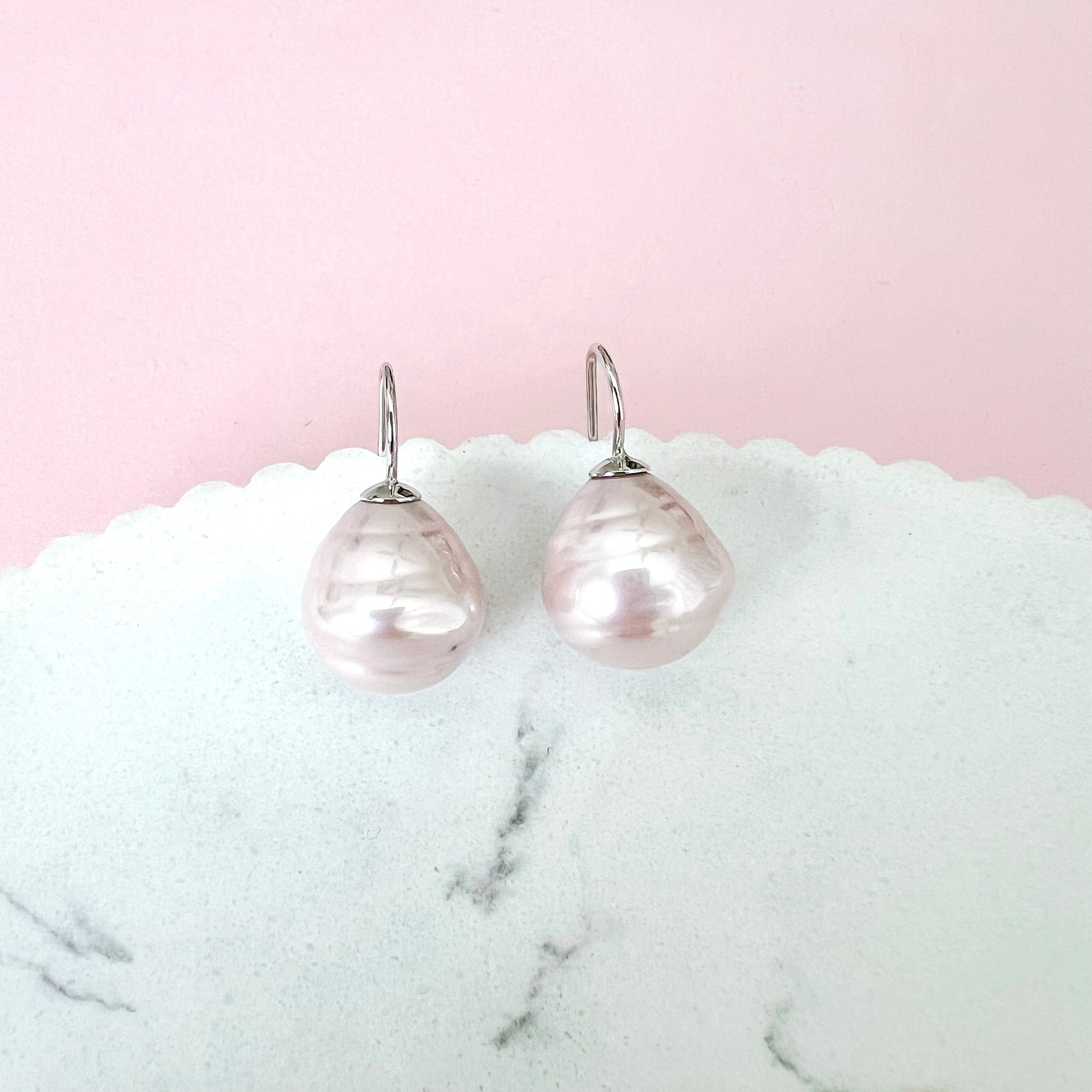 Featuring handmade pale pink coloured Spanish crystal pearls (around 14x16mm ea), with nickel free rhodium plated hooks.