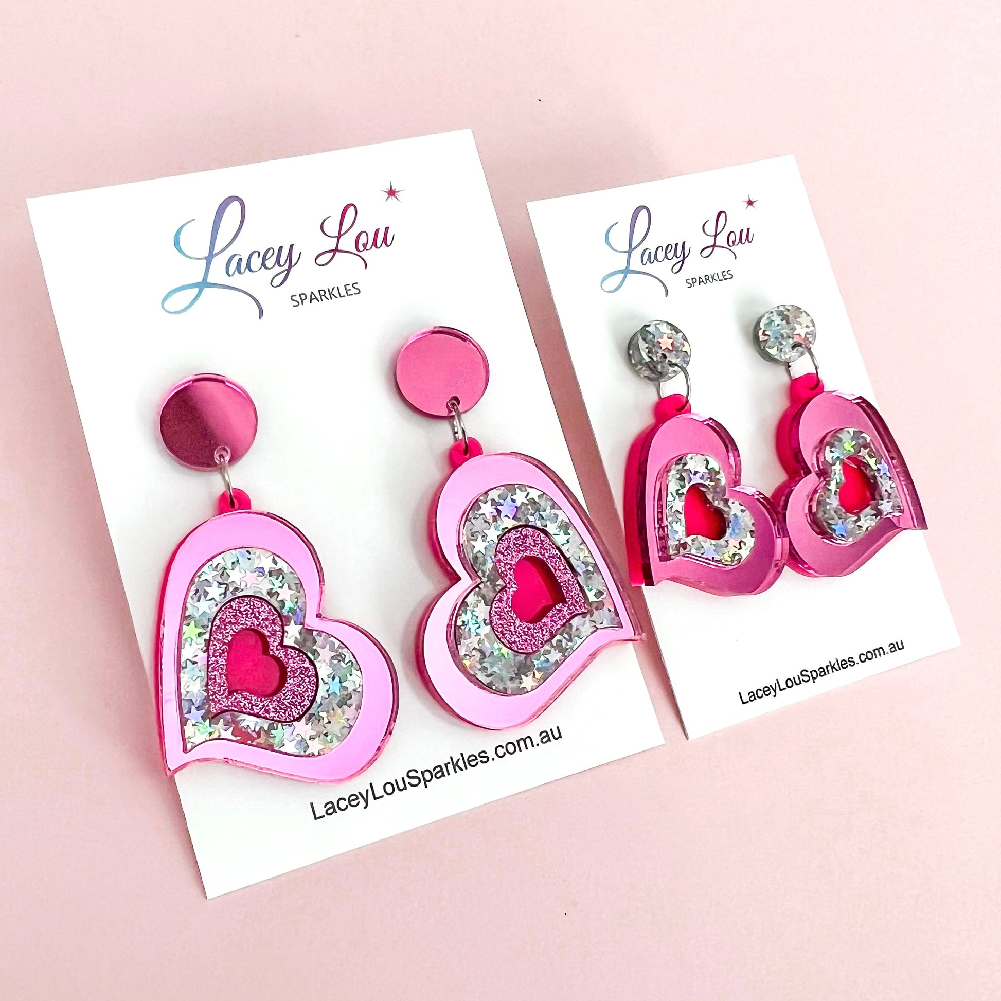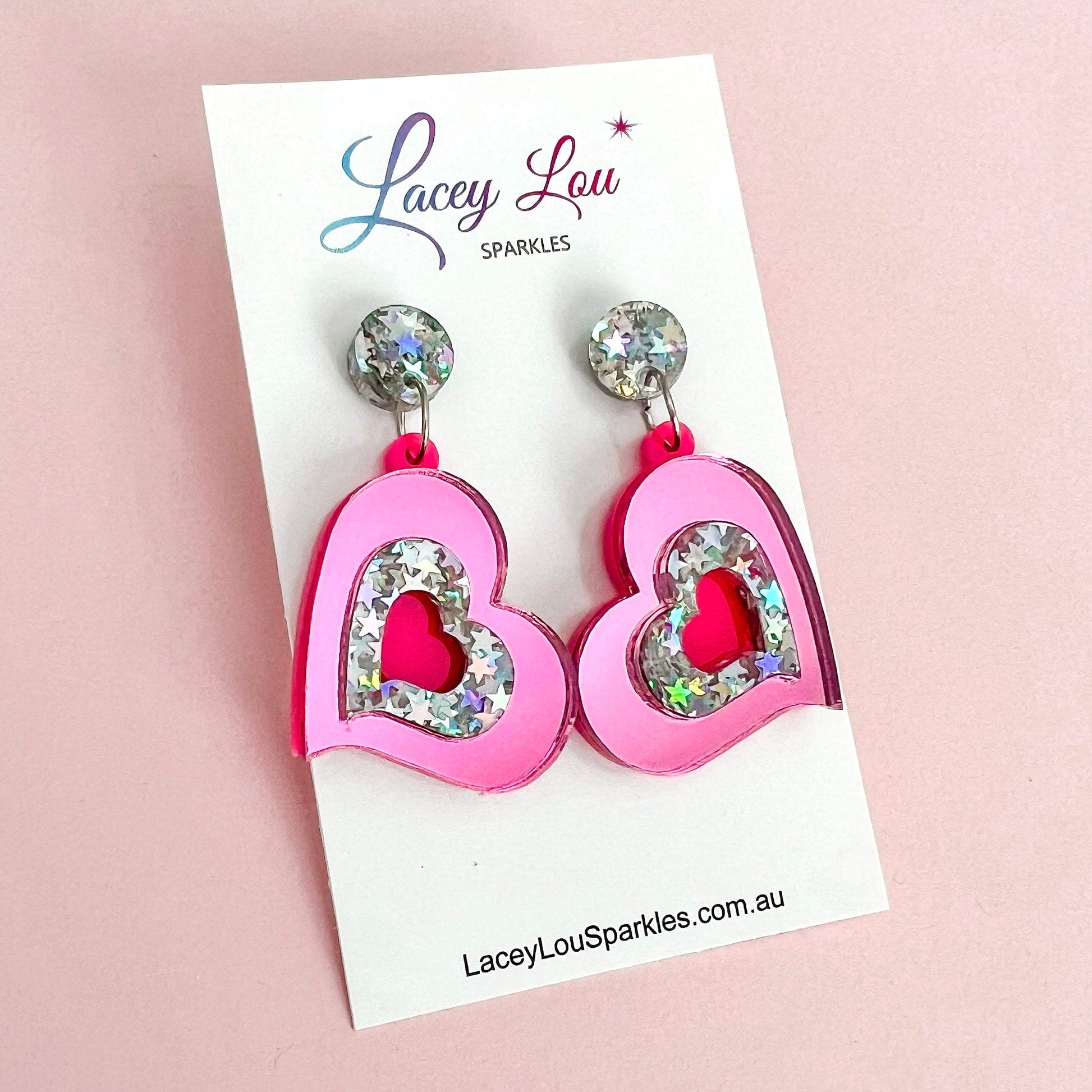 Small Pink Heart Dangles - Fuchsia Glitter Statement Acrylic Earrings