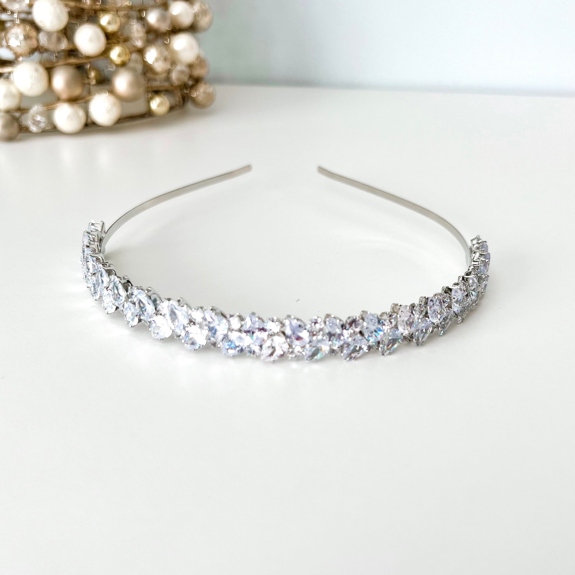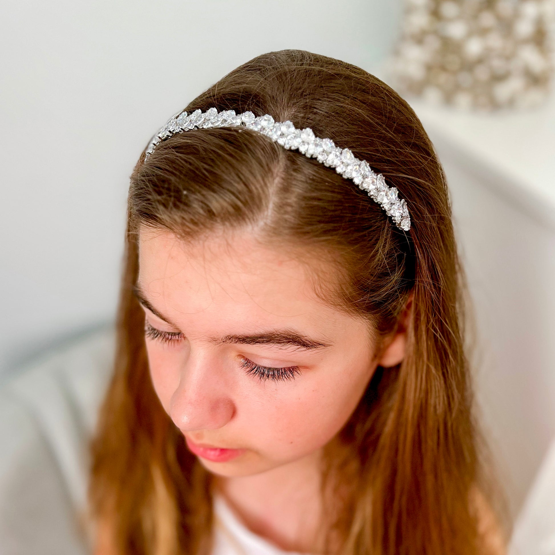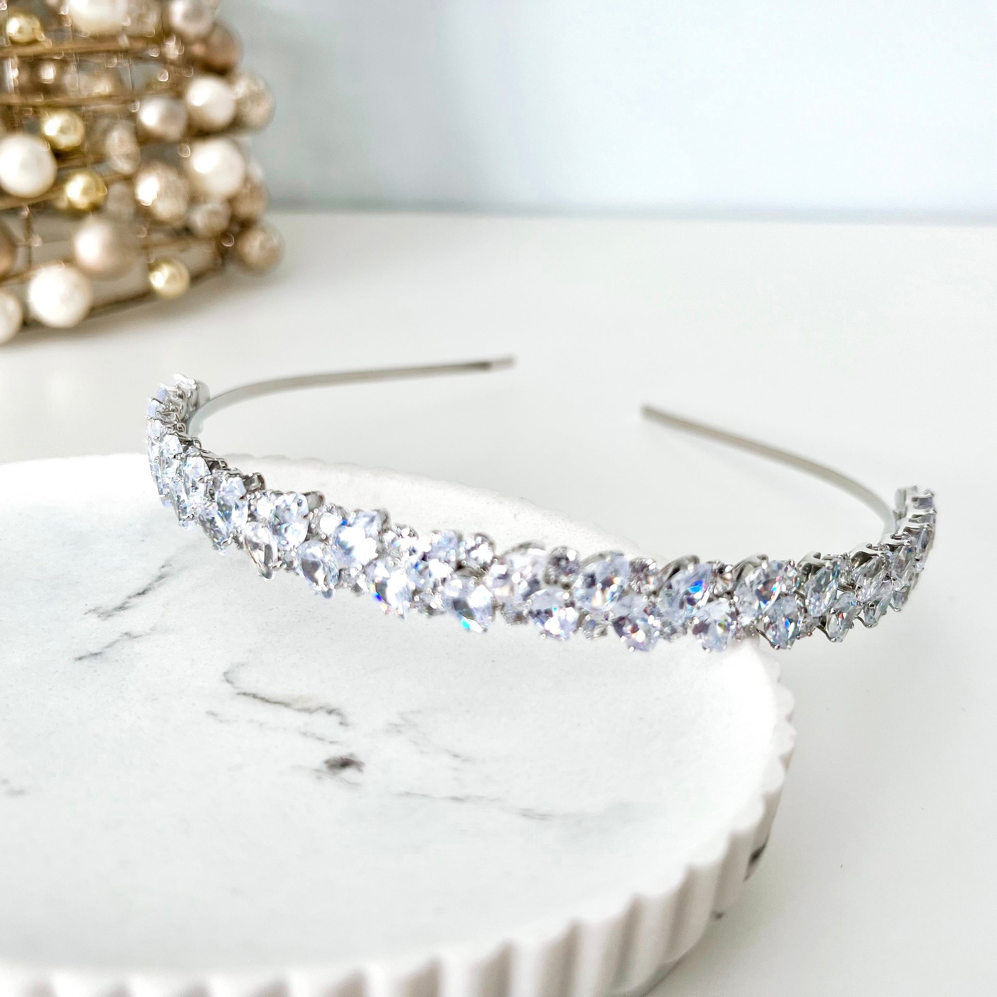 Meet our stunning crystal Alice headband, featuring a double row of small crystal rhinestones attached to a silver metal Alice band. This sparkly headband makes a beautiful accessory for Christmas, spring racing, or a special occasion formal or wedding.